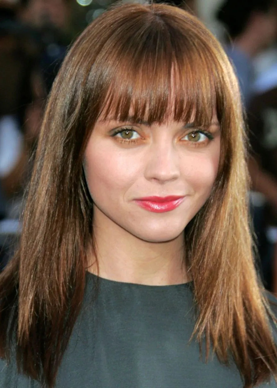 Medium Hairstyle Women's Straight Human Hair Wigs Bangs Style Lace Front Cap Wigs 16Inch